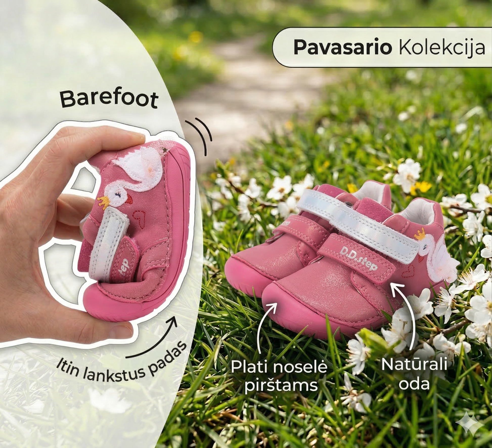 D.D.Step „BAREFOOT“ batų padas pagamintas iš ypatingai plonos gumos, todėl bėgimo ir vaikščiojimo metu vaikai gali jausti pagrindą, yra išlaikomi natūralūs pėdos judesiai ir pėdai yra užtikrinama tinkama apsauga. Platus batų pagrindas nespaudžia pėdos, todėl vaiko pėdos kaulai bei sausgyslės gali nevaržomai augti bei vystytis. Tai ypatingai svarbu kojos pirštams, nes jie atsakingi už pusiausvyrą ir tinkamą motoriką. Minimalistinio dizaino avalynė užtikrina pėdos apsaugą ir yra ypatingai lanksti, todėl vaiko pėdos sausgyslės ir raumenys gali nevaržomai išsitempti ir susitraukti.